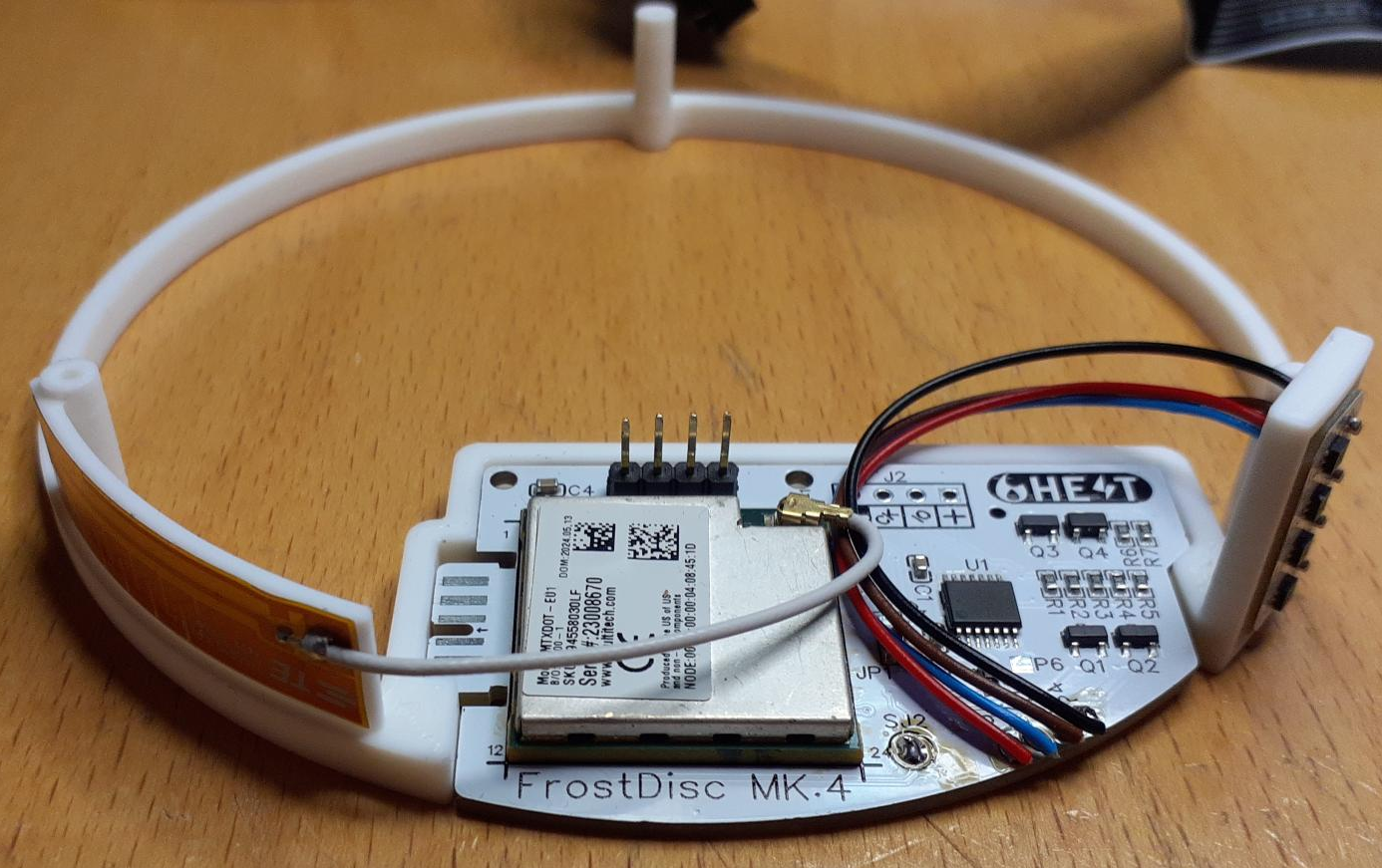 FrostDisc is nearing completion. The radio board and sensor boards have now been installed onto the inner frame. Also the flexible antenna has been installed. We are really close now! Only missing the power board, which should arrive from PCB assembly in the following weeks.